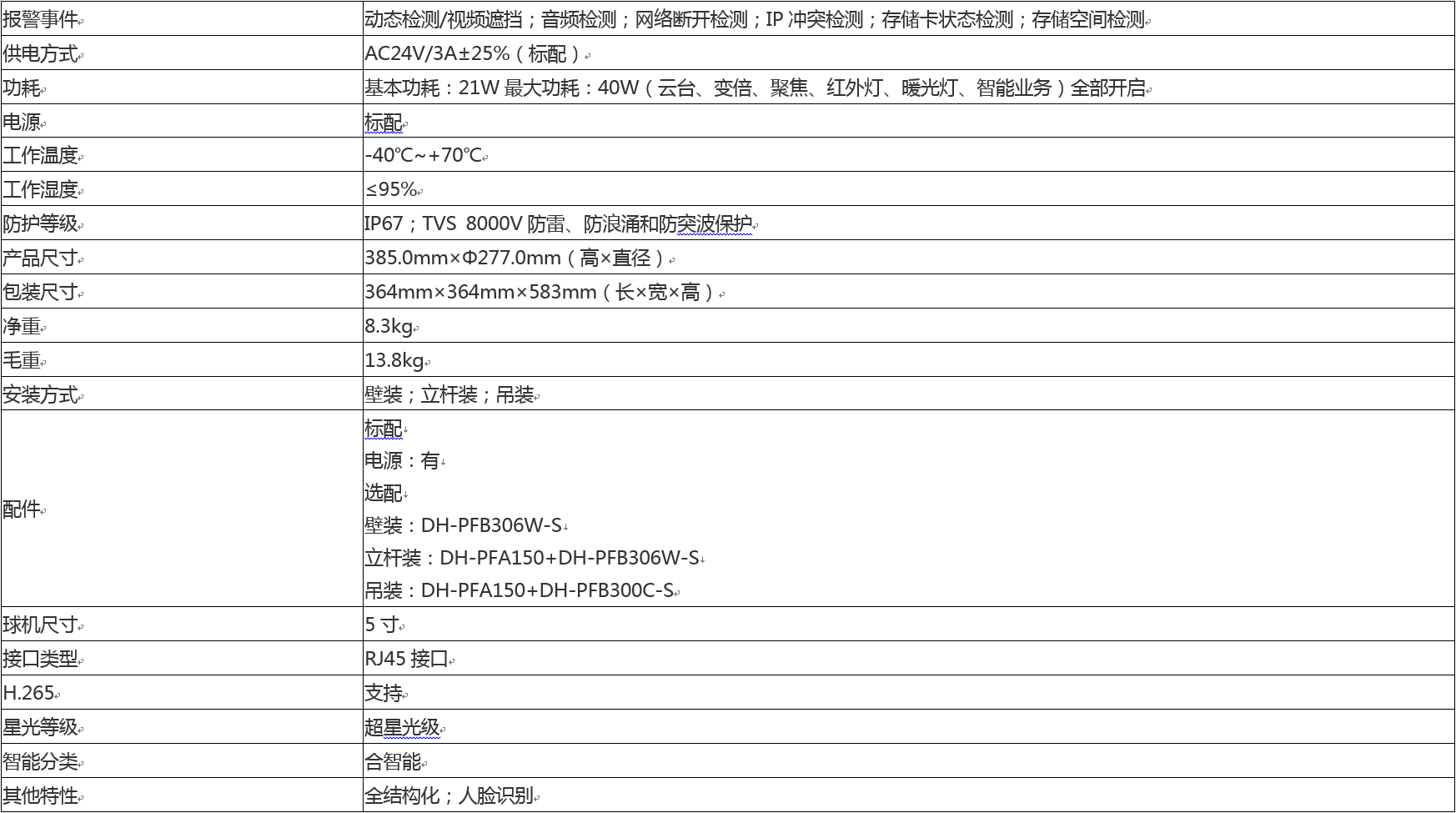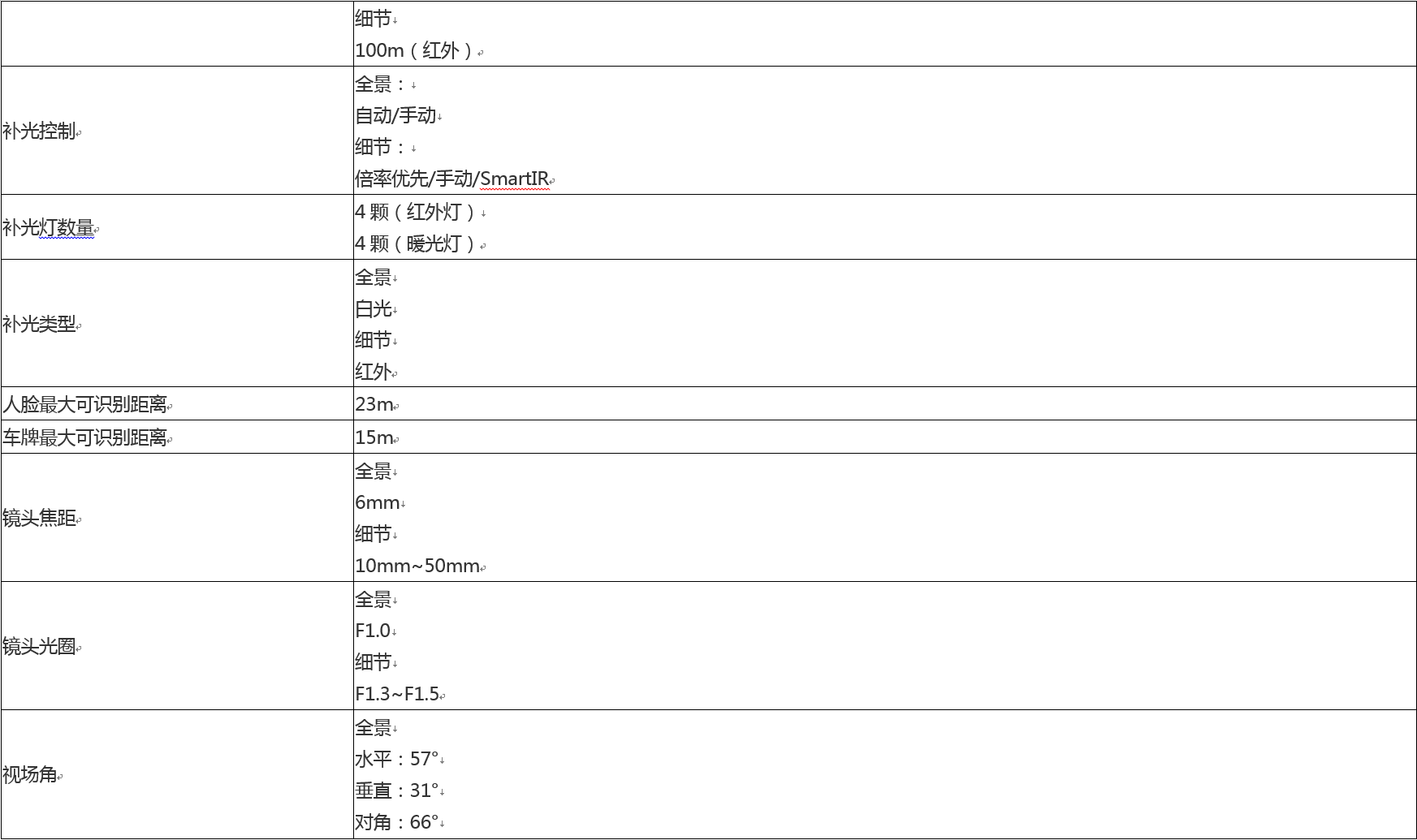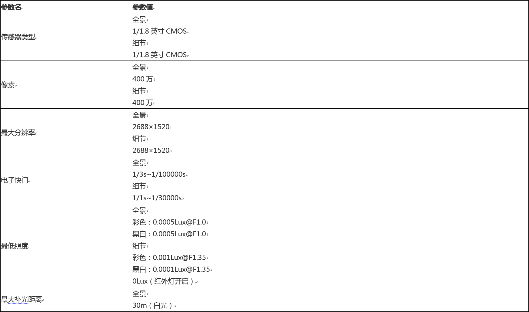 内置GPU芯片,支持深度学习算法,有效提升检测准确率 支持视频结构化功能:支持机动车抓拍、机动车属性提取,支持非机动车抓拍、非机动车属性提取,支持人体抓拍、人体属性提取,支持人脸抓拍、人脸属性提取,支持机非人数量统计,搜索报表(球机) 支持人脸检测;支持人脸优选抓拍;支持人脸增强;支持人脸属性提取;支持7种属性5种表情:性别,年龄,眼镜,表情,口罩,;支持多种人脸抠图方案设置:单寸照,人脸;支持人脸识别(前端支持导入1万张人脸库) 支持绊线入侵、区域入侵、穿越围栏、徘徊、物品遗留、物品搬移、快速移动、停车、人员聚集检测;支持人车分类报警;支持联动跟踪 枪球一体化设计,兼顾全景与细节,达到单个产品既能看全也能看清的优势 支持双云台,设备具备全景、细节两个通道且都支持远程转动调节位置,灵活布控 细节相机支持5倍光学变倍,16倍数字变倍 全景细节都采用400万像素1/1.8英寸CMOS传感器 支持超星光级超低照度。全景相机:0.0005Lux/F1.0(彩色),0.0005Lux/F1.0(黑白);细节相机:0.001Lux/F1.35(彩色),0.0001Lux/F1.35(黑白) 支持H.265编码,实现超低码流传输 全景相机内置30米白光灯补光,采用暖色调和柔化处理,有效降低炫目程度;细节相机内置100米红外灯补光,采用倍率与红外灯功率匹配算法,补光效果更均匀 全景相机:水平范围:0°~360°连续旋转、垂直范围:0°~30° 细节相机:水平范围:0°~250°,垂直范围:-10°~90 支持300个预置位,8条巡航路径,5条巡迹路径 支持1路音频输入和1路音频输出 内置2路报警输入和1路报警输出,支持报警联动功能 支持IP67防护等级,8000V防雷、防浪涌和防突波保护 支持AC24V±25%宽电压输入